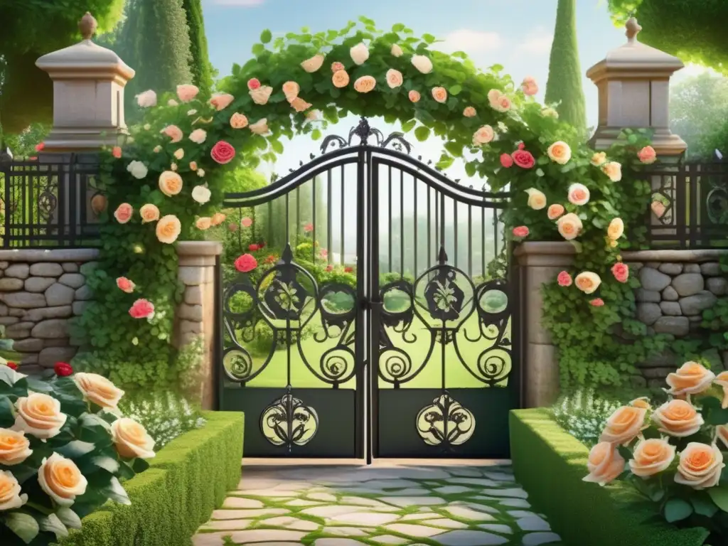 Jardín literario con plantas clásicas, simbolismo y tranquilidad